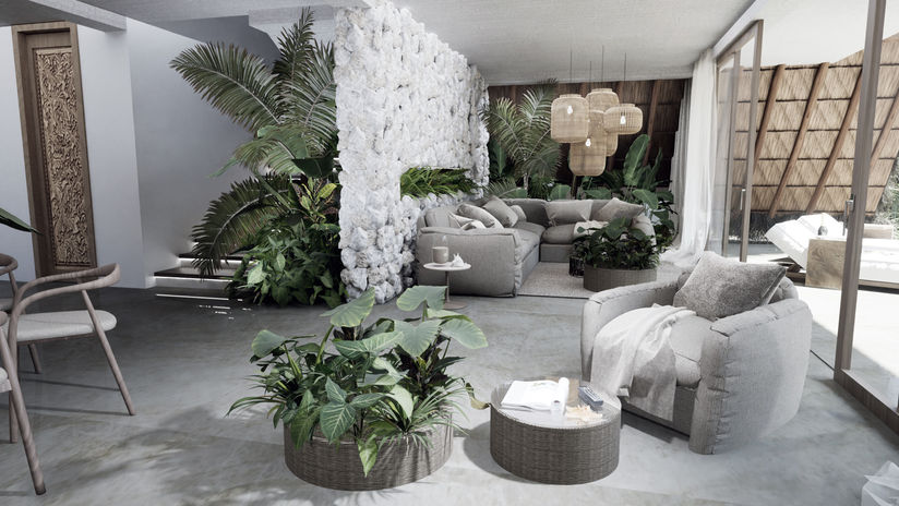Prírodný interiér navrhnutý, aby ladil s tradičným charakterom miestnej architektury.